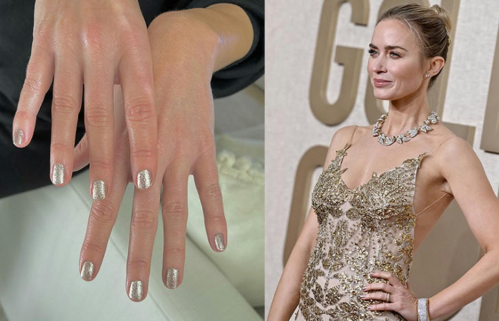 - A closer look at Emily Blunt’s Golden Globes manicure, which Kandalec created to go high-glam with her gown.