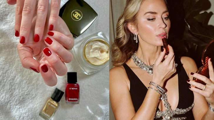 Celebrity nail trends are extending beyond colors, with textures and finishes becoming trends in and of themselves. “Trends are definitely going sparkly, glitter, metallic, lots of flash,” says Kandalec. For the Golden Globes, Kandalec painted a glittery rose gold Gel Bottle gel nail polish on Blunt’s fingertips, aligning with the reflective embroidery on her Alexander McQueen gown. “Emily and I don’t normally do sparkle, so this was something fun for us and the red carpet,” Kandalec explains.