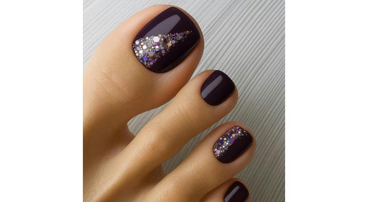 Holiday toenail art doesn’t have to use classic Christmas colors. Shades such as eggplant, aubergine, or deep purple offer a modern alternative.