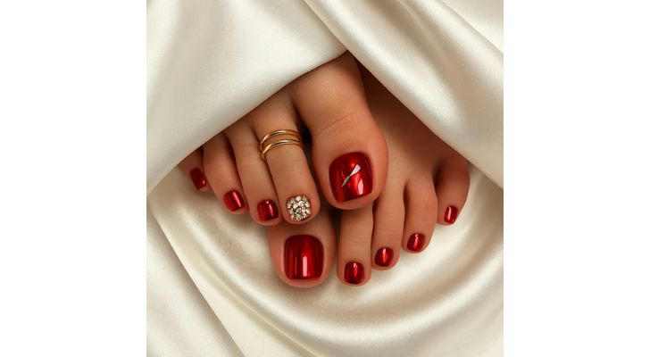 Red is often associated with warmth and celebration, while gold is linked to festive decorations and light. A red base combined with gold chrome, metallic accents, or rhinestones creates a bold yet elegant pedicure.