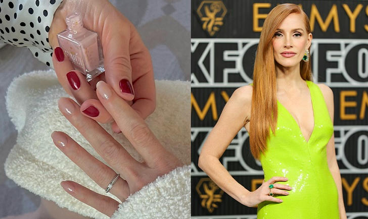 *Celebrity nail artist Julie Kandalec paints a sheer, soft pink polish on Jessica Chastainβs fingertips for the 2024 Emmy Awards.