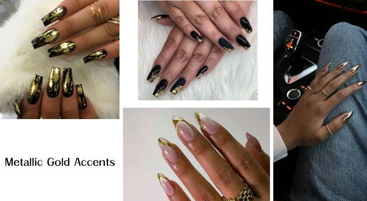 Gold lines, foils, or full chrome nails bring luxury and brightness during colder months.