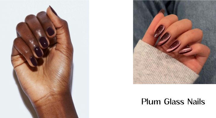 Sheer plum shades create a “glass” manicure effect that is subtle yet elegant.
